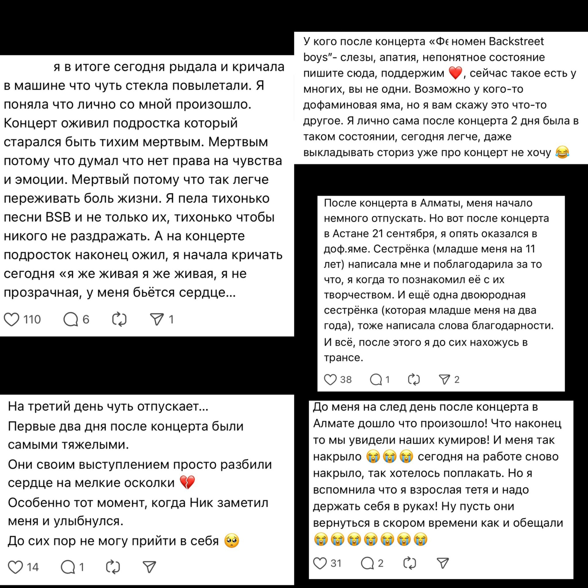 "Была на концерте — и такое чувство, будто мне вернули кусочек детства, а потом резко отняли. Ничто больше не радует, только пересматриваю видео и слушаю 'Shape of My Heart'. Это не просто дофаминовая яма — это феноменальная депрессия по Backstreet Boys", — поделилась одна из фанаток.