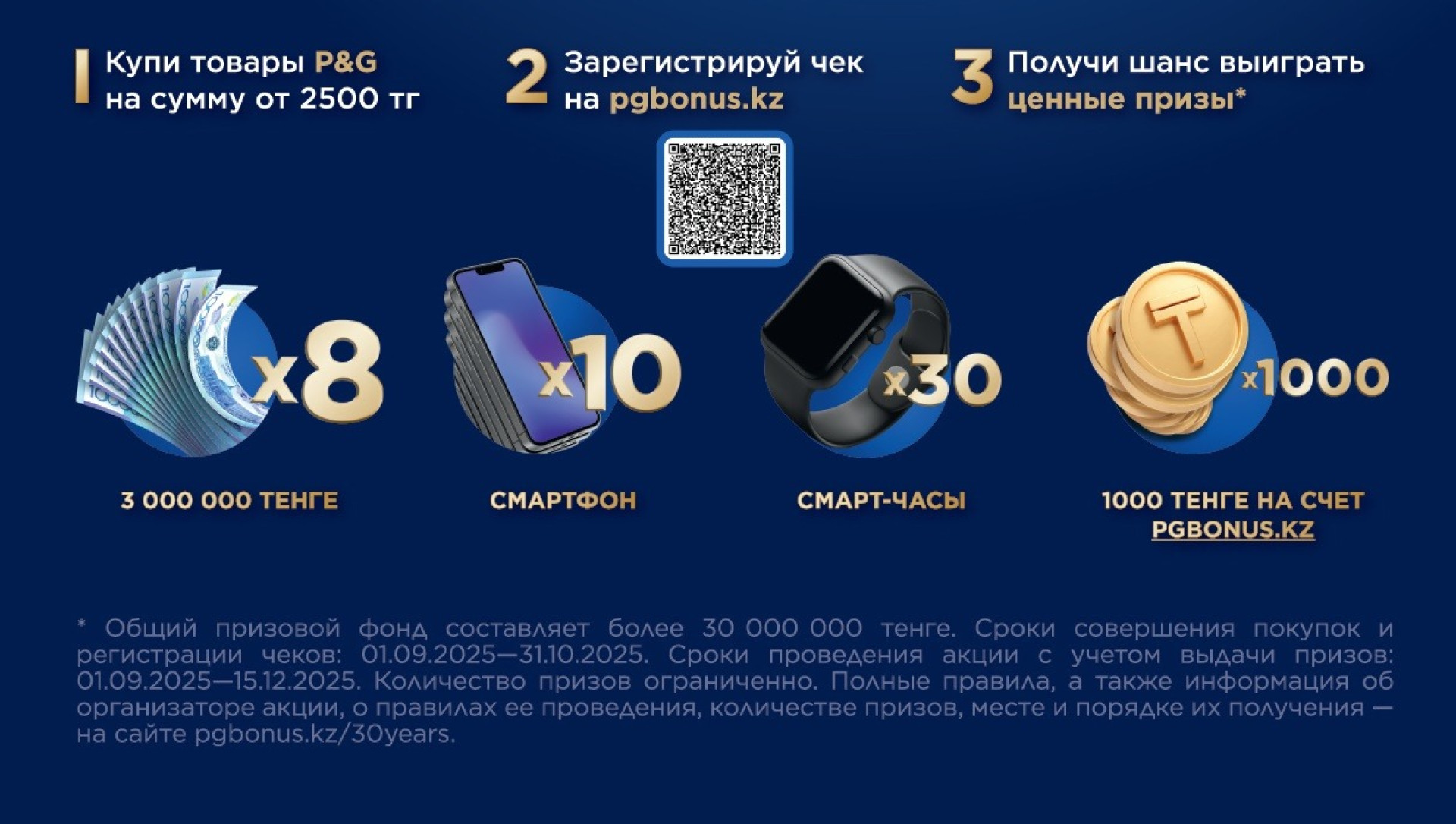 К юбилею P&G подготовила специальную акцию для покупателей под названием "Сіз барда – біз бармыз! Спасибо, что вы с нами!" С 1 сентября по 31 октября 2025 года покупатели могут приобрести товары P&G на сумму от 2500 тенге, зарегистрировать чек на сайте и участвовать в еженедельных розыгрышах призов. Общий срок акции и розыгрышей продлится до 15 декабря 2025 года, а призовой фонд составляет 30 миллионов тенге, включая смартфоны, смарт-часы и денежные призы до 3 миллионов тенге, а также бонусы на счет pgbonus.kz.