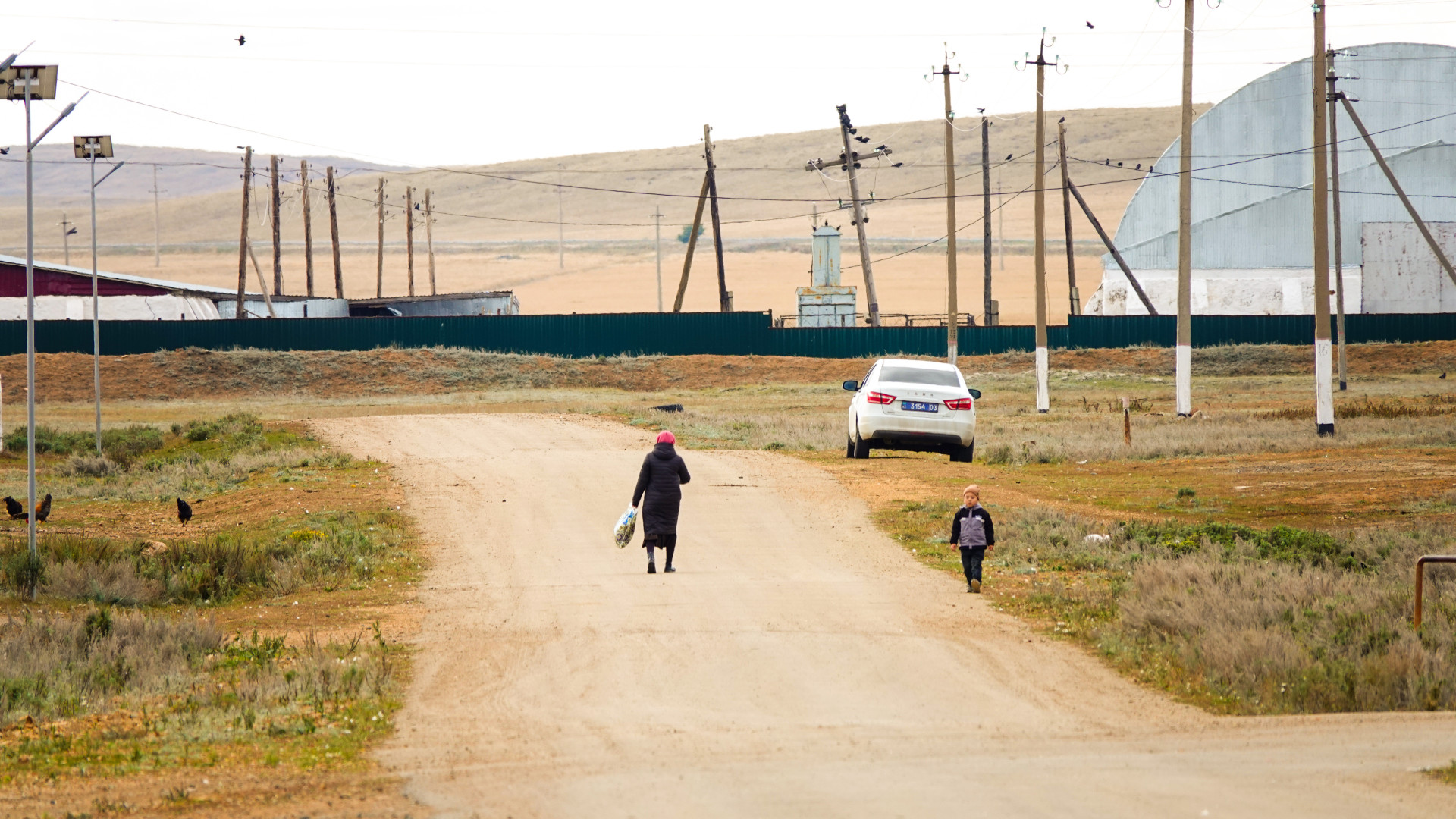 В селе живут утки, куры и коровы, которые настороженно относятся к незнакомцам и внимательно следят за их передвижениями.