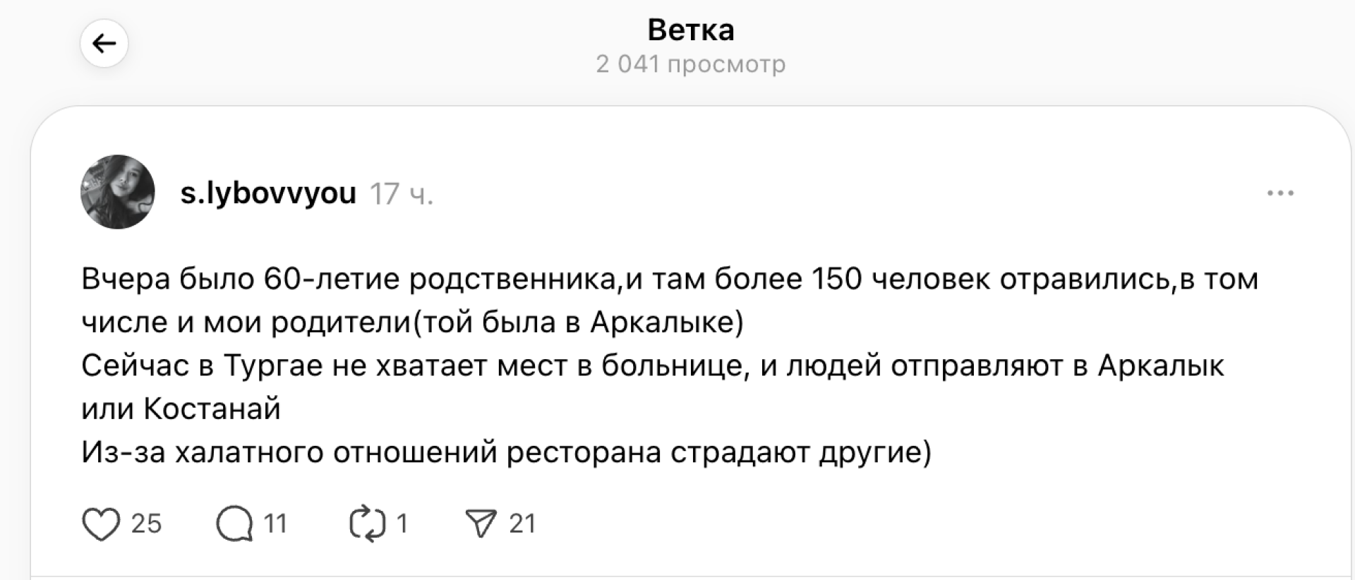 В Аркалыке зафиксировано массовое отравление гостей, которые принимали участие в праздновании 60-летия родственника. По информации автора поста в Threads, после торжества более 150 человек, включая родителей девушки, начали испытывать симптомы отравления.