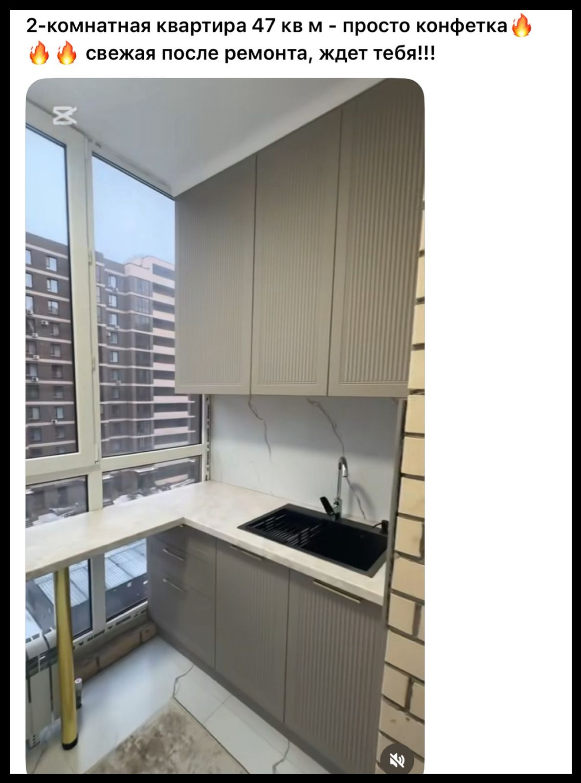 На платформе Threads один из жителей Астаны разместил объявление о продаже однокомнатной квартиры. Внимание пользователей привлекло нестандартное решение: на месте балкона разместили раковину, плиту и кухонные шкафы, а доступ к кухне осуществляется через спальню.