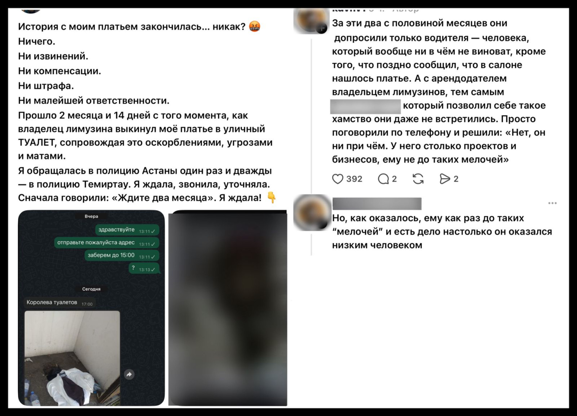 Инцидент произошёл после свадебной поездки, когда 26-летняя девушка забыла своё платье в лимузине. Водитель отказался вернуть забытое, и, по всей видимости, выбросил его в туалет. Эта ситуация вызвала широкий резонанс и активное обсуждение в обществе, публикация о ней собрала более 470 тысяч просмотров и почти тысячу комментариев.