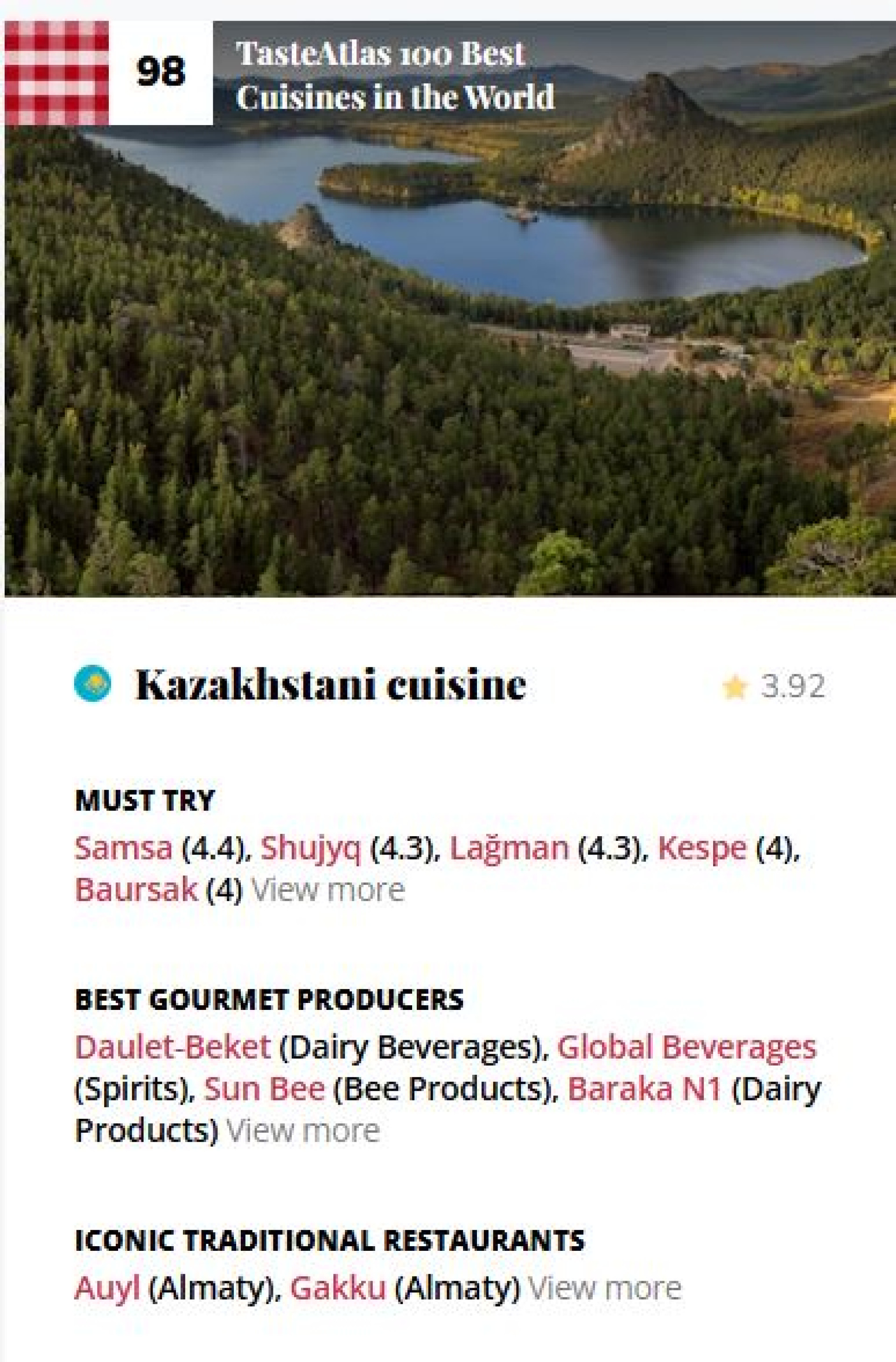 Казахстан получил 98-е место с средней оценкой 3,9. Несмотря на низкое место в общем рейтинге, некоторые блюда казахской кухни были высоко оценены пользователями.