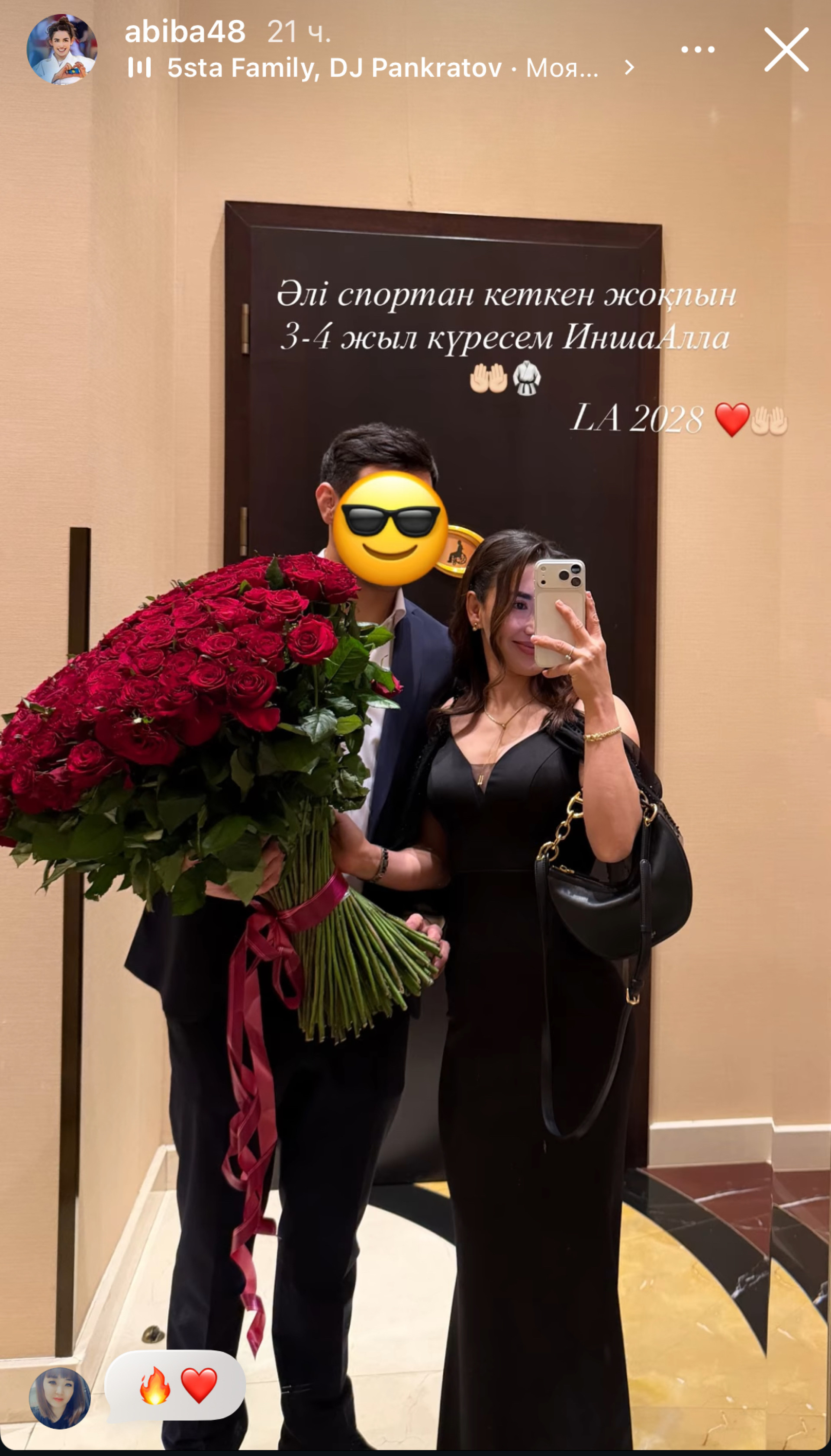 Абиба сообщила: "Я еще не ушла из спорта, буду бороться еще 3–4 года. LA 2028". Напомним, что она недавно объявила о своей помолвке, но дату свадьбы пока не раскрыла.