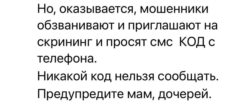 "Оказывается, мошенники звонят и приглашают на скрининг, просят сообщить СМС-код с телефона. Ни в коем случае нельзя сообщать этот код. Предупредите мам и дочерей", – делится своим опытом одна из жительниц Казахстана.