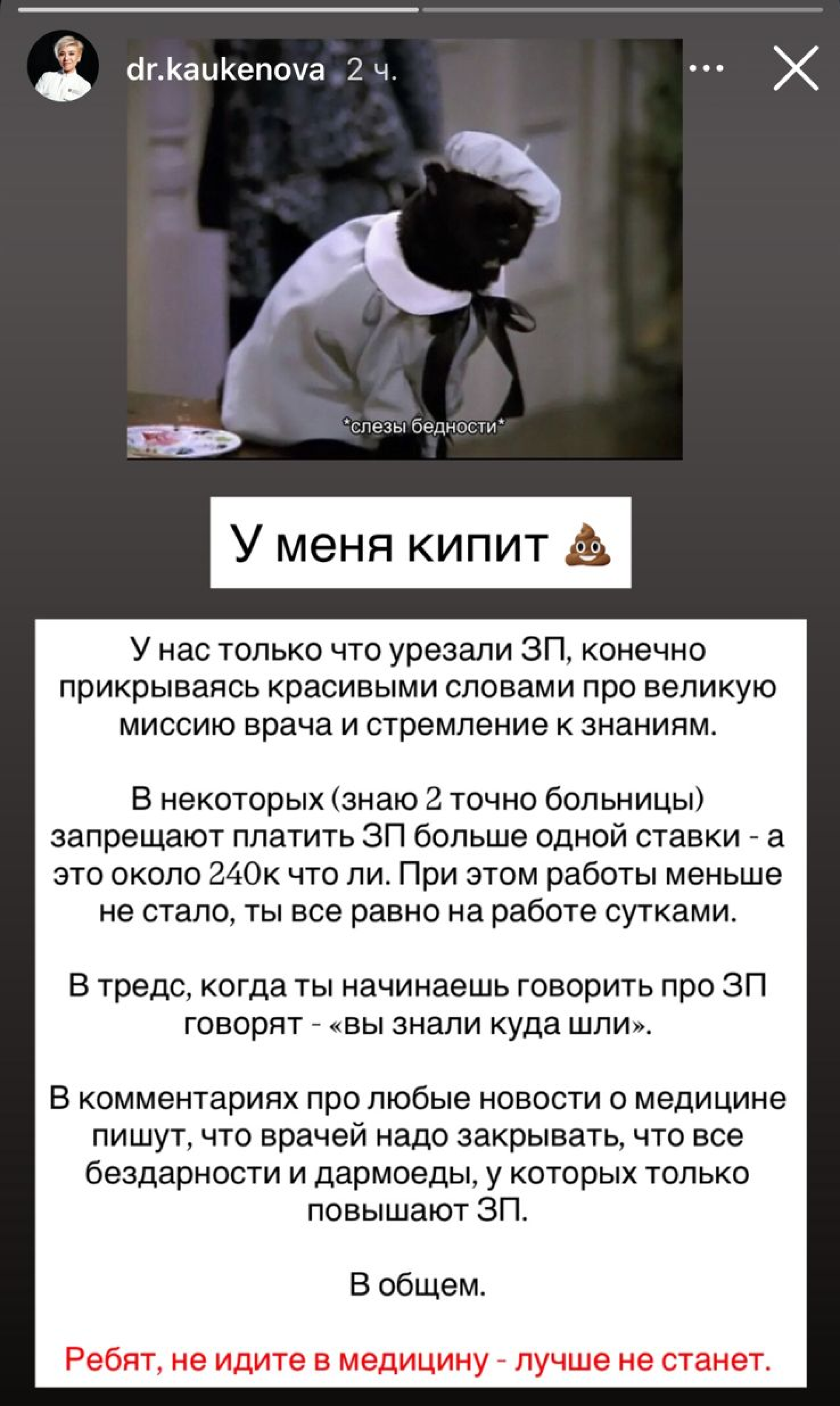 "В комментариях про любые новости о медицине пишут, что врачей надо закрывать, что все бездарности и дармоеды, у которых только повышают зарплаты. В общем, ребята, не идите в медицину," — так начинается пост молодого врача из Астаны, Ботагоз Каукеновой. Она активно обсуждает проблемы, с которыми сталкиваются молодые специалисты в области медицины.