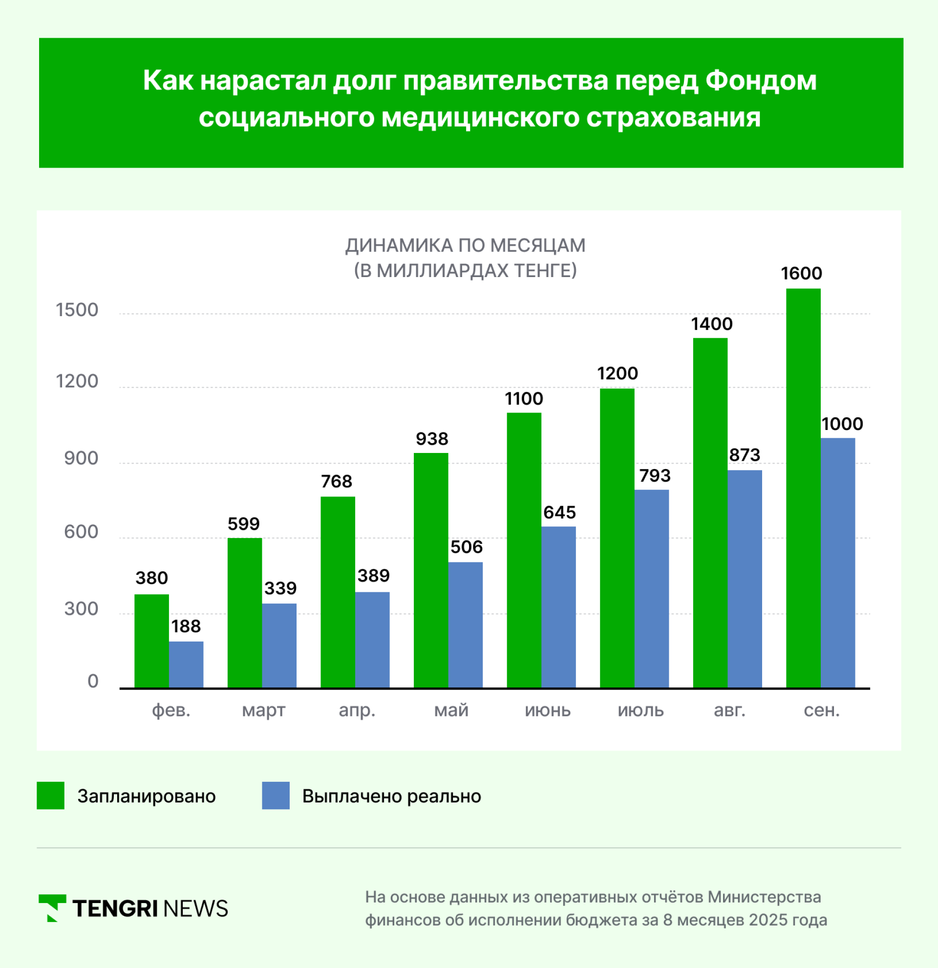 Долг перед ФСМС не является новой проблемой. Анализ оперативных отчетов Министерства финансов за последние восемь месяцев показывает, что задолженность накапливается с прошлого года, и выплаты регулярно отставали от плана.