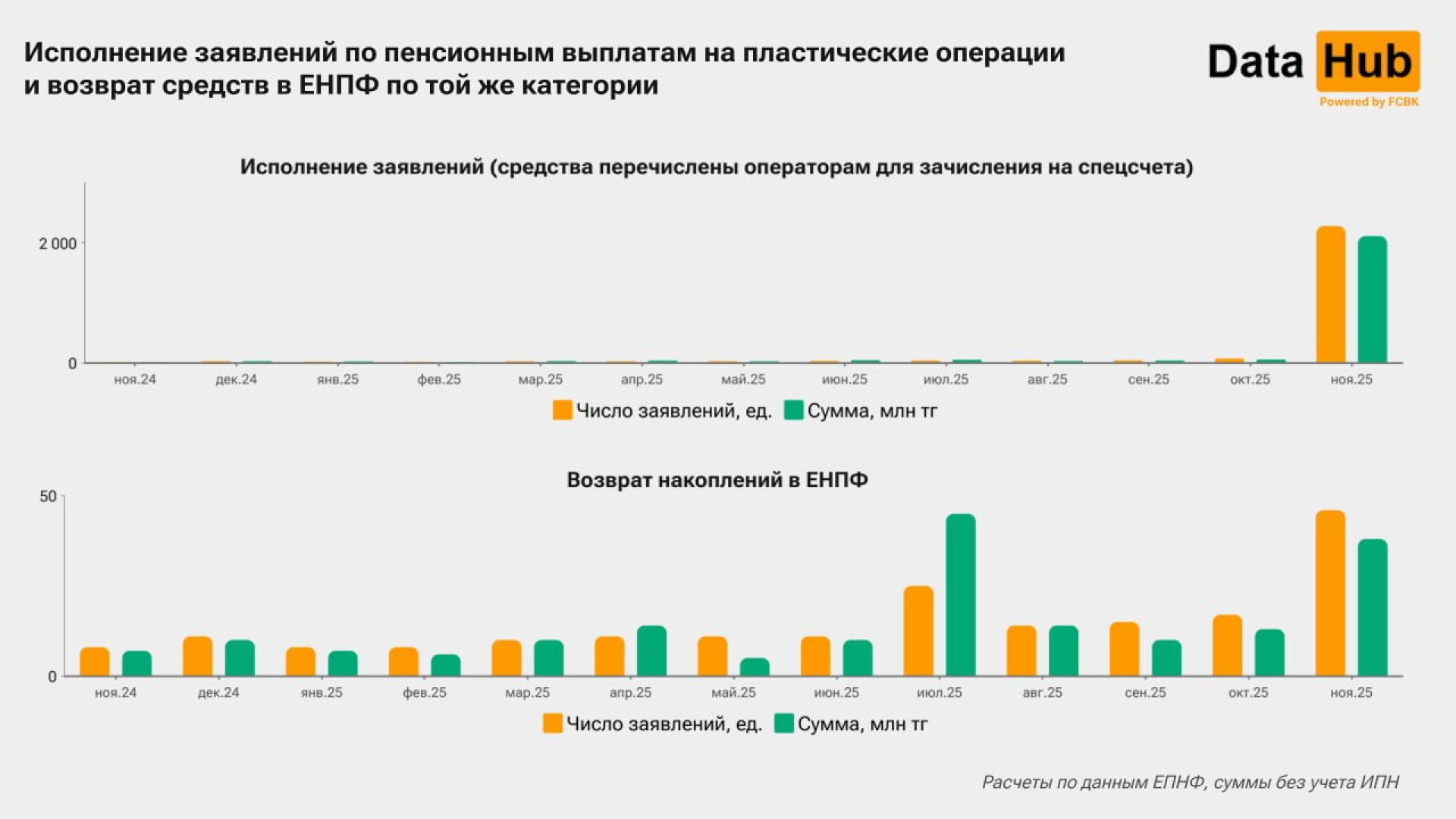 "Для понимания масштабов: с начала программы и до 1 ноября общее число исполненных заявлений составляло 1631 единицу, сумма не доходила до 1,6 миллиарда тенге, то есть за все время совокупные объемы были меньше, чем оказались за один прошлый месяц. Вообще, новые эпизоды взрывного роста в изъятиях на лечение стали появляться после того, как в сентябре был прекращен прием заявок по стоматологии, ранее основному направлению для медицинского использования пенсионных средств. Причиной послужили многочисленные случаи фальсификаций", - говорится в публикации Data Hub.