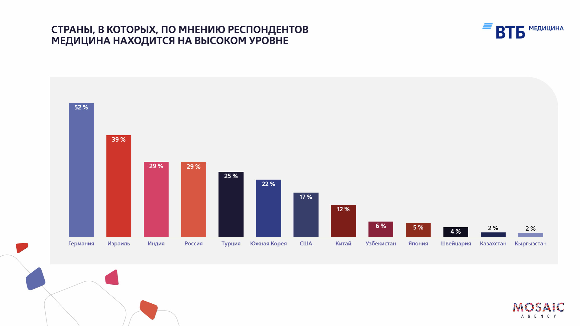 По результатам опроса, лидерами по качеству медицины и уровню сервиса стали Германия, Южная Корея и Израиль. Россия также демонстрирует рост доверия среди пациентов из стран СНГ и Центральной Азии, что связано с высокой квалификацией специалистов, доступом к современным технологиям и положительными результатами лечения. С 2021 по 2024 год российские клиники оказали помощь более 5 миллионам пациентов из Казахстана, Узбекистана и Кыргызстана.