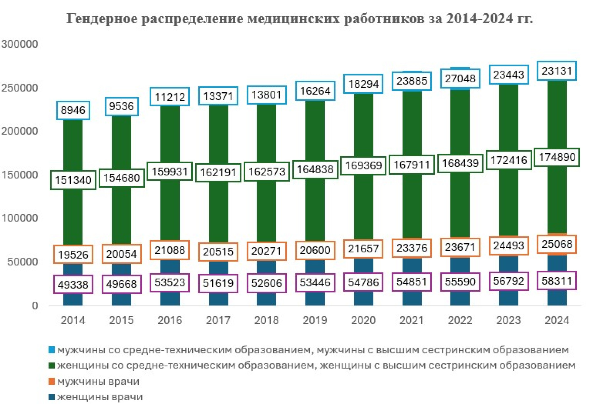 За последние десять лет в Казахстане наблюдается увеличение гендерного разнообразия среди медицинских работников, однако основная нагрузка по-прежнему лежит на женщинах. Сегодня их доля составляет 83% от общего числа медиков в стране, включая врачей, медсестер, акушерок и других специалистов. Из 83 379 врачей страны более 70% — это женщины (58 311 человек), в то время как мужчины составляют около 30% (25 068 человек).